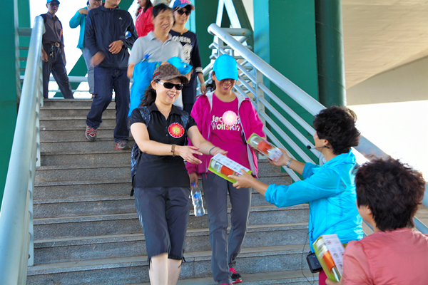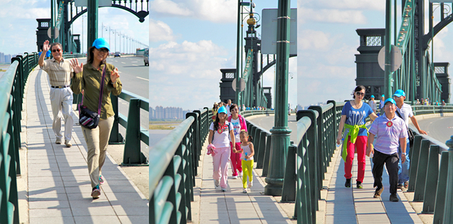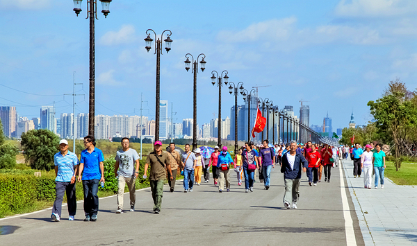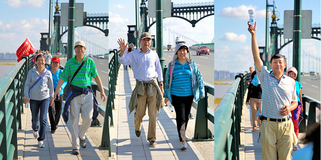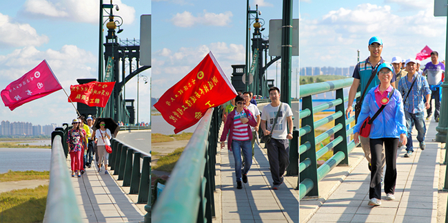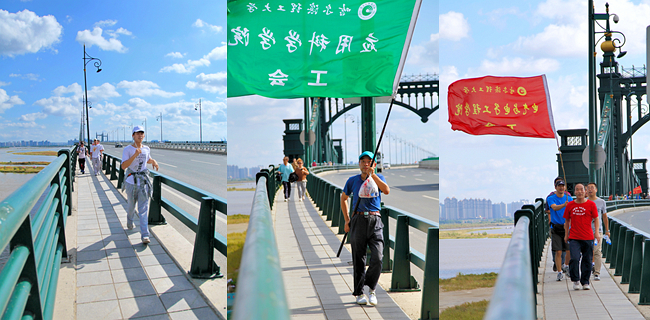 本次徒步活动的起点是群力音乐主题公园,各基层工会在起点处高举会旗,合影留念。整齐的徒步队伍有序地行进在阳明滩大桥上,大家呼吸着清新甜润的空气,享受着秋风拂面的惬意,欣赏着道路两旁的美景,感受着家乡日新月异的发展变化。徒步的队伍中既有即将退休的老教师,也有刚刚参加工作的青年教师,他们时而交流工作,时而沟通友谊,一路上欢歌笑语、气氛和谐。当走到终点时,老师们都已汗流浃背,但脸上都挂着灿烂的笑容,尽情享受着运动带来的快乐。