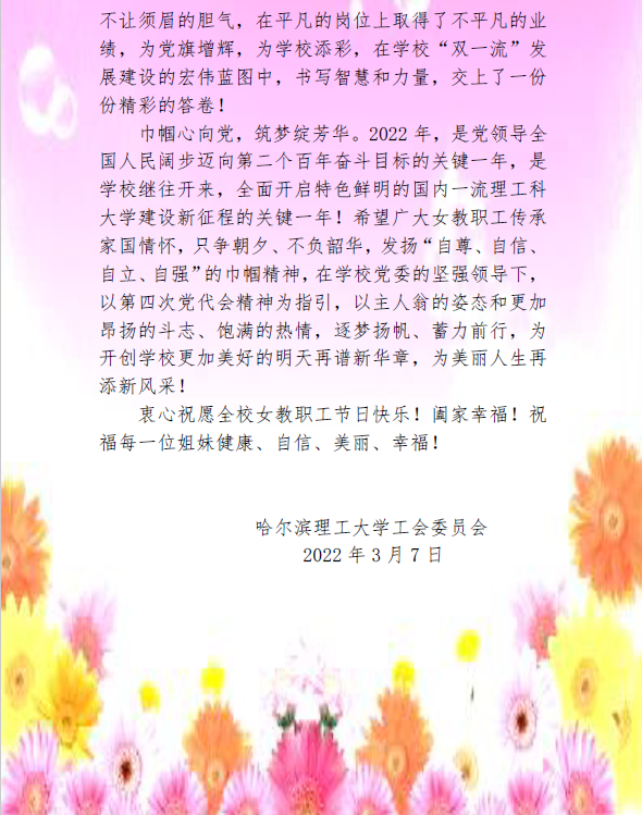 巾帼心向党,筑梦绽芳华。2022年,是党领导全国人民阔步迈向第二个百年奋斗目标的关键一年,是学校继往开来,全面开启特色鲜明的国内一流理工科大学建设新征程的关键一年!希望广大女教职工传承家国情怀,只争朝夕、不负韶华,发扬“自尊、自信、自立、自强”的巾帼精神,在学校党委的坚强领导下,以第四次党代会精神为指引,以主人翁的姿态和更加昂扬的斗志、饱满的热情,逐梦扬帆、蓄力前行,为开创学校更加美好的明天再谱新华章,为美丽人生再添新风采!