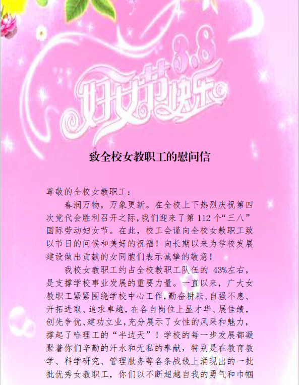 衷心祝愿全校女教职工节日快乐!阖家幸福!祝福每一位姐妹健康、自信、美丽、幸福!