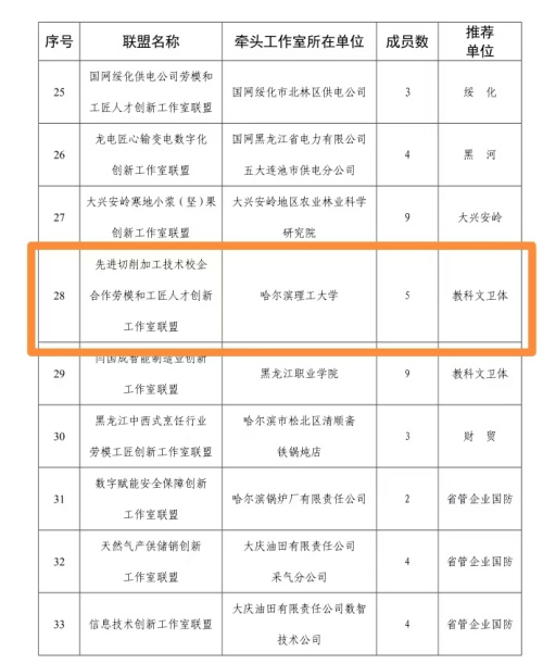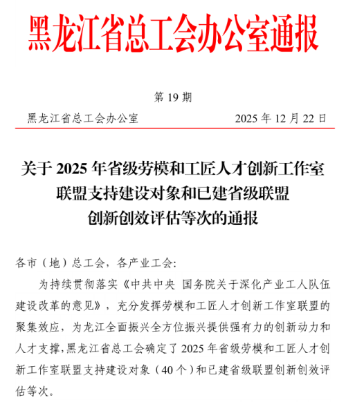 2025年12月22日,黑龙江省总工会发布通报,我校先进切削加工技术校企合作劳模和工匠人才创新工作室联盟成功入选2025年省级劳模和工匠人才创新工作室联盟支持建设对象。这一殊荣,既是省级层面对联盟在产学研协同创新、技能人才培育领域实践成果的高度肯定,更彰显了学校长期深耕产学研融合发展、赋能产业升级的深厚积淀与综合实力,亦是学校工会助力科研创新、多维度推进校企合作进程中斩获的又一标志性成果。